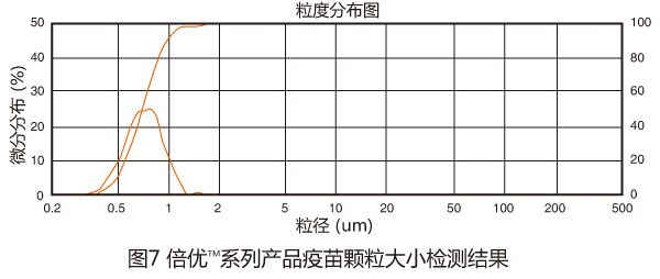 倍優?系列產品每一個疫苗毒株均單獨接種雞胚,分別采毒后經超高超微分離濃縮后再純化,高度去除雞胚尿棄液中的尿酸鹽、脂多糖等雜質,經過高度純化和超高濃縮后,在進行抗體復配,確保抗原成分單一,從而保證乳化后的疫苗顆粒大小適中、均勻,有效刺激機體產生高而待久的抗體水平;倍優?系列產品疫苗顆粒大小0.5~0.6μm ,該大小顆粒占95%以上(圖7)。
