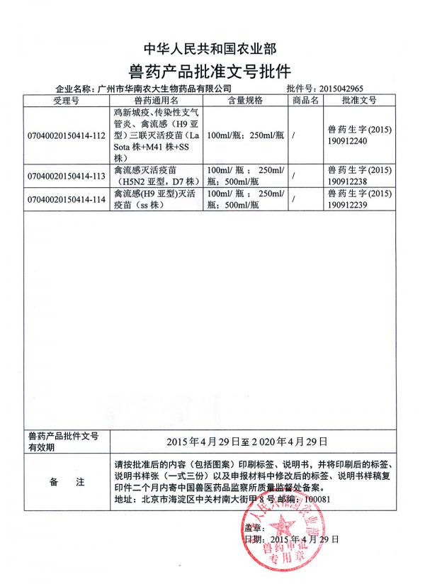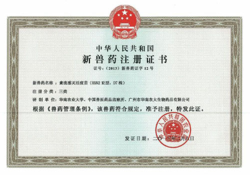 目前已獲得國家農業(yè)部新獸藥證書及產品批準文號。