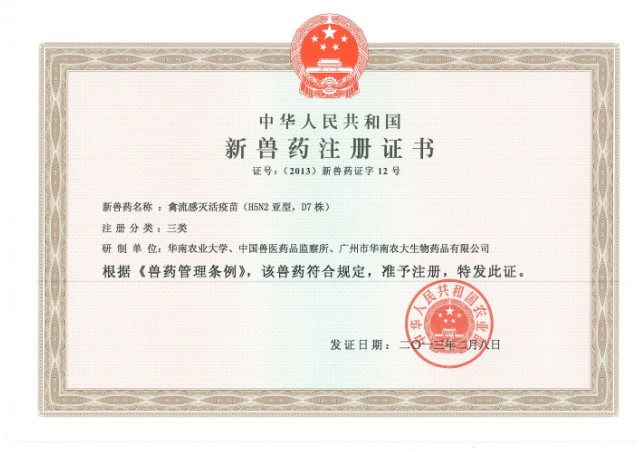 根據《獸藥管理條例》和《獸藥注冊辦法》規定,廣州市華南農大生物藥品有限公司與華南農業大學、中國獸醫藥品監察所3家單位共同申報的禽流感滅活疫苗(H5N2亞型,D7株)通過了國家農業部的審查,批準為新獸藥。即將取得農業部核發的《新獸藥注冊證書》,證書主要信息如下: