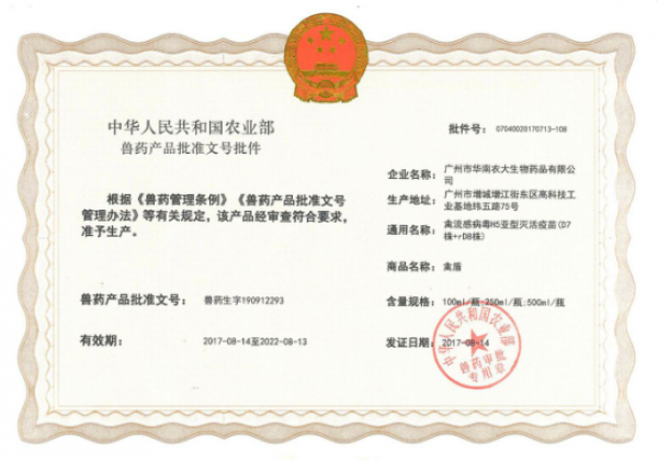 2017年8月14日,由華南農(nóng)業(yè)大學(xué)、中國獸醫(yī)藥品監(jiān)察所、廣州市華南農(nóng)大生物藥品有限公司(以下簡稱“華南生物”)共同研發(fā)的禽流感病毒H5亞型滅活疫苗(D7株+rD8株)通過農(nóng)業(yè)部獸藥產(chǎn)品批準(zhǔn)文號的審批,喜獲得農(nóng)業(yè)部核發(fā)的獸藥產(chǎn)品批準(zhǔn)文號——獸藥生字190912293;商品名:禽盾。