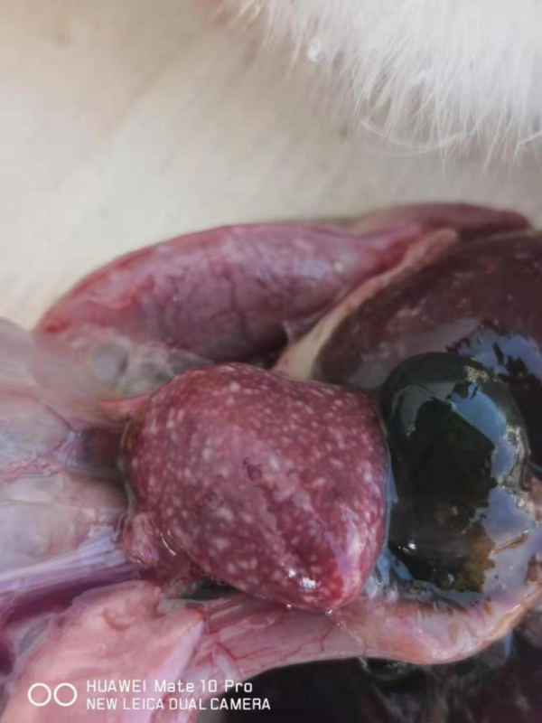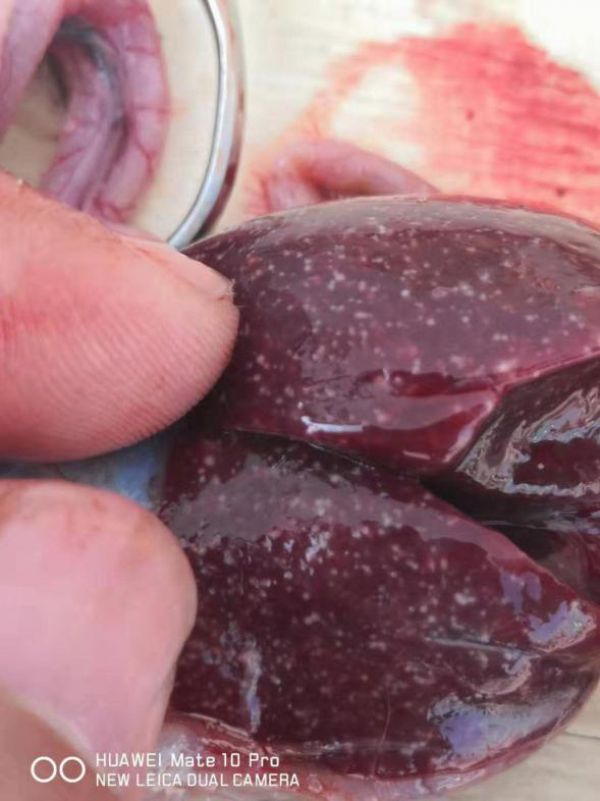 剖檢27天齡病死的小鵝,可見肝臟、脾臟、腎臟、腸道彌散針尖大白色壞死點。見下圖