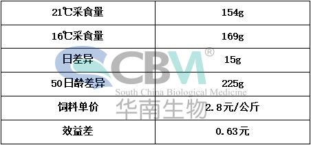 35日:齡雞在不同溫度條件下單只日采食量及效益差