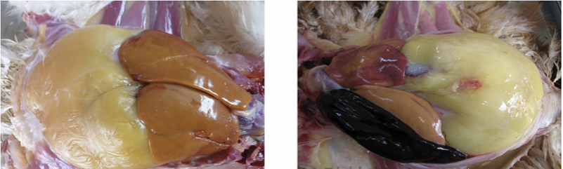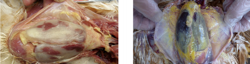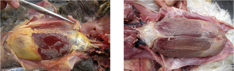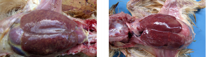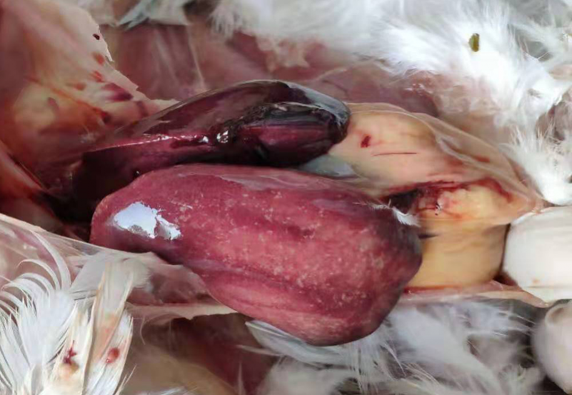 1、雞大腸桿菌病:肝臟、心臟的周圍形成一層灰白色或灰黃色纖維素性包膜,又稱作包心、包肝。