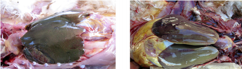 3、禽傷寒:肝臟變成淡綠棕色或古銅綠色,肝臟表面有時有灰白色米粒狀壞死點。