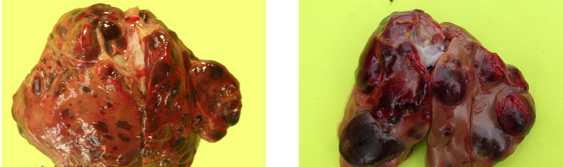 6、雞馬立克氏病:內臟型馬立克肝臟比正常大 3-5 倍,表面和切面可見灰白色斑駁狀腫瘤病灶。