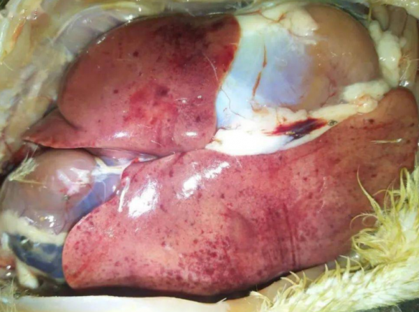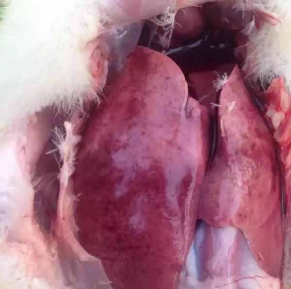 鴨肝炎病毒潛伏期一般為1~4d,突然發(fā)病,病程短促。病初表現(xiàn)為精神萎靡,眼半閉呈昏睡狀,羽毛松亂,翅下垂,行動呆滯,縮頸呆立,食欲不振甚至厭食、絕食;發(fā)病12~24h即出現(xiàn)神經癥狀,病鴨全身性抽搐、運動失調、兩腳痙攣,身體倒向一側或就地旋轉,頭向后仰呈角弓反張狀,故俗稱“背脖病”。少數病鴨死亡前排黃白色和綠色稀糞,數小時后死亡。也有的雛鴨無明顯臨床癥狀便突然死亡。 剖析可見肝臟特征性病變:肝臟腫大,質地柔軟,呈淡紅色或花斑狀,表面有出血點和出血斑,膽囊擴張,充滿膽汁。脾臟有時腫大,也呈斑駁狀。腎臟充血、腫脹,呈暗紫色樹枝狀。