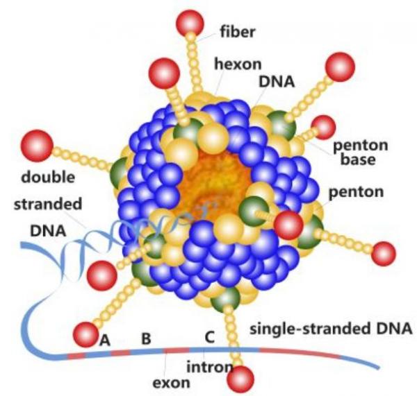 FAdV-Ⅰ為腺病毒科腺病毒屬病毒,無囊膜,直徑為70-90nm,呈20面體對稱結(jié)構(gòu)。表面由252個(gè)殼粒組成,包括240個(gè)六棱體和12個(gè)五棱體,每個(gè)五棱體有2條纖維突起。中間包著直徑60-65nm的髓蕊(雙股DNA和核蛋白),殼粒排列在三角形的面上,每邊6個(gè)殼粒。禽腺病毒具有2根長度相近的纖絲,纖絲的長度與抗原性有關(guān)。